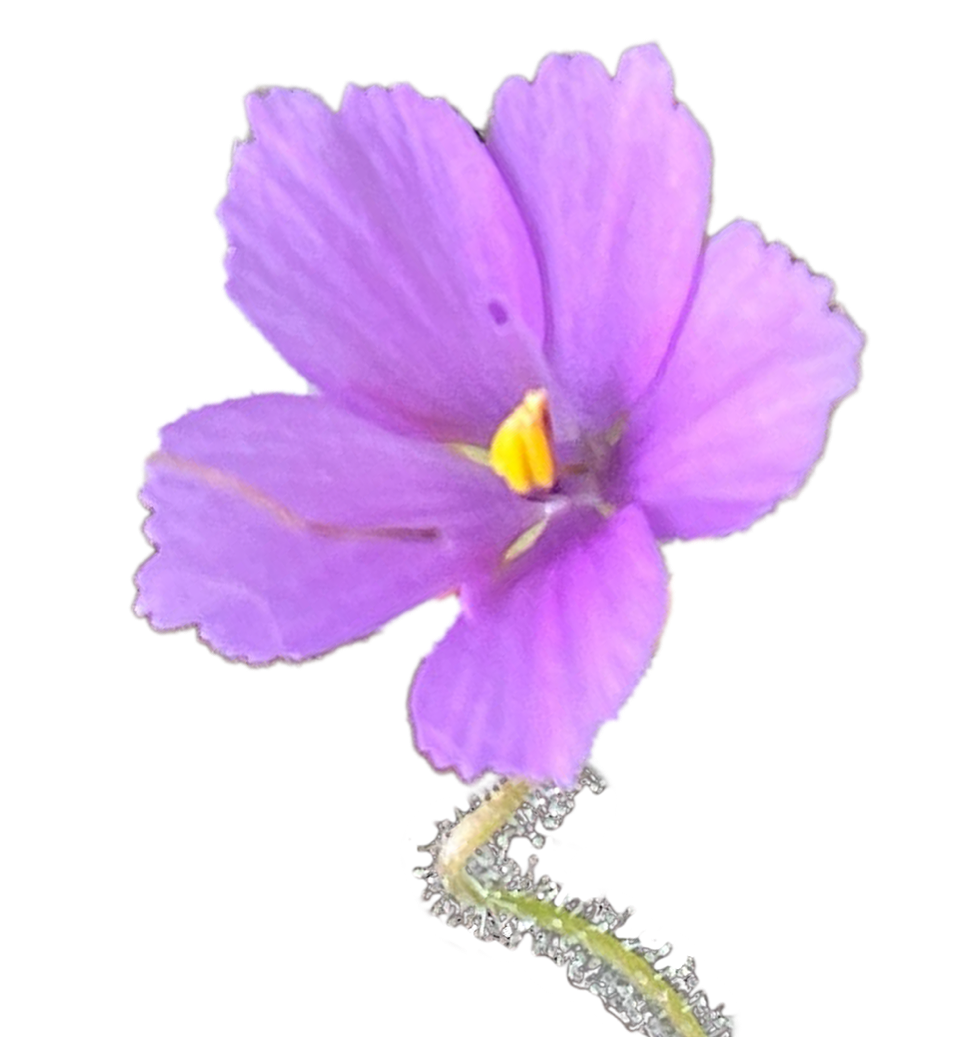 Byblis plants are carnivorous plants covered in glistening droplets of sticky nectar, which are secreted by special glandular hairs on the stems, leaves, and flowers. These droplets resemble morning dew, making the plant appear almost iridescent in sunlight—hence the name Rainbow Plant.