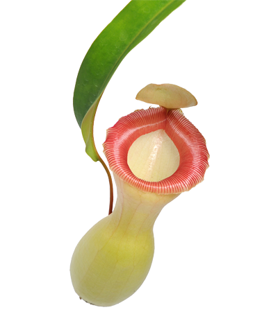 All Nepenthes species are carnivorous and use hanging or ground-level pitchers to trap insects. Depending on the species, these exotic pitchers can grow up to 35 cm in length, varying greatly in shape, size, and color. Each pitcher is filled with digestive fluid, attracting prey with sweet nectar. Once an insect or small animal falls inside, the slick interior walls prevent escape, and the prey is gradually dissolved and absorbed by the plant.